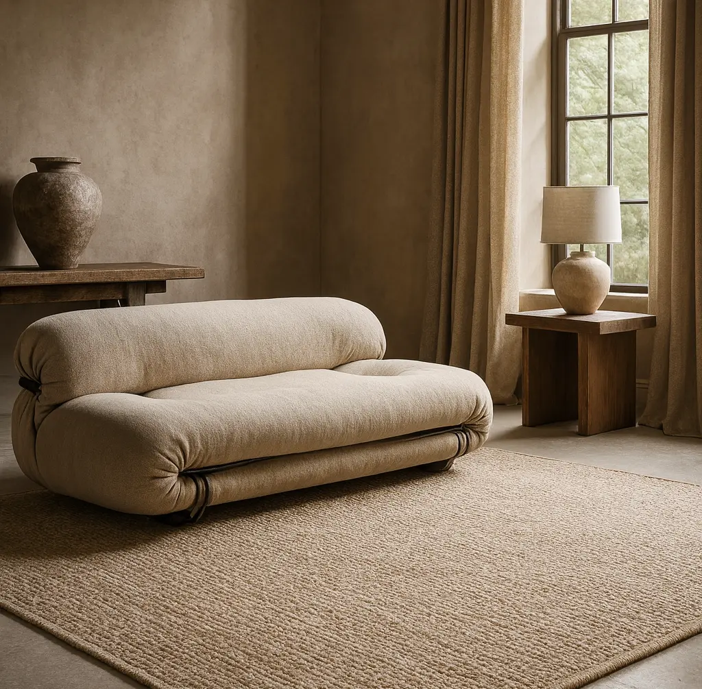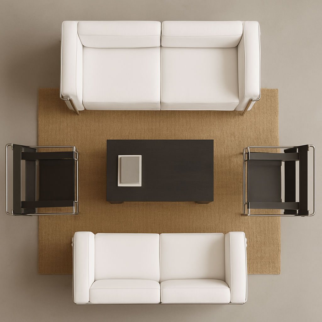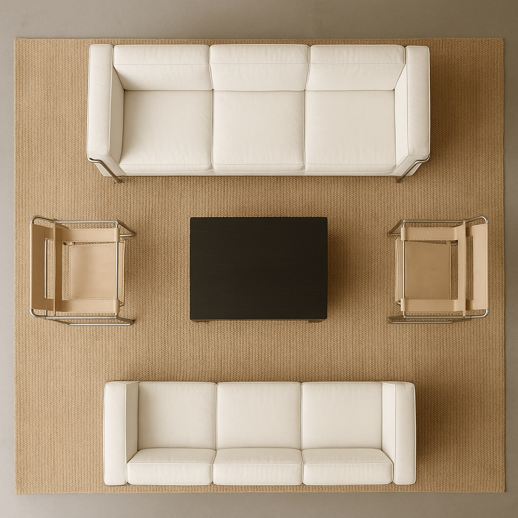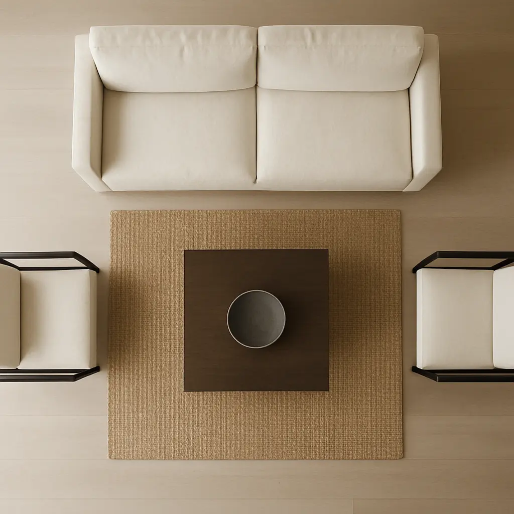 Para ampliar una sala pequeña, usa una alfombra del ancho del sofá (150×240 cm o 180×270 cm) y coloca los muebles alrededor.