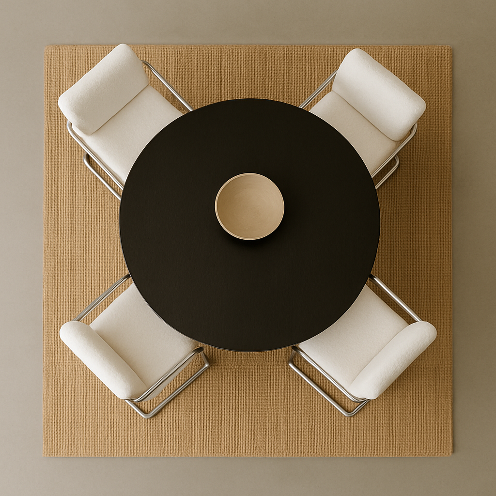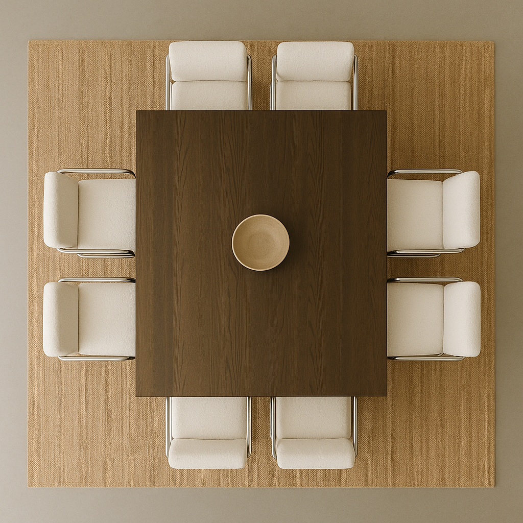 Para 4–8 personas, usa alfombra 240×240 cm o 240×300 cm para un marco elegante.