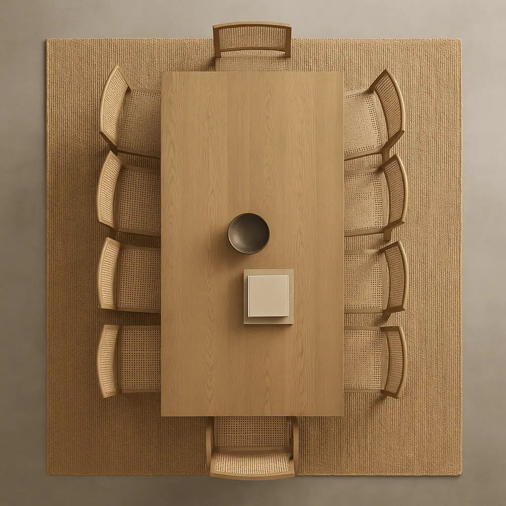 Para 8–10 personas, ideal 270×360 cm, que enmarca y da presencia a la mesa.