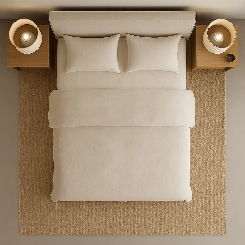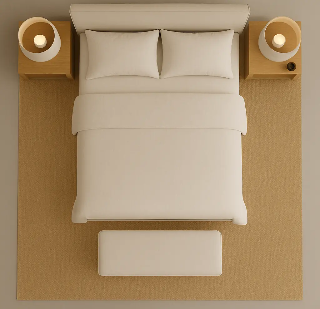 Cama king: alfombra 270×360 cm o 360×450 cm, dejando espacio a los lados y suavizando el ambiente.