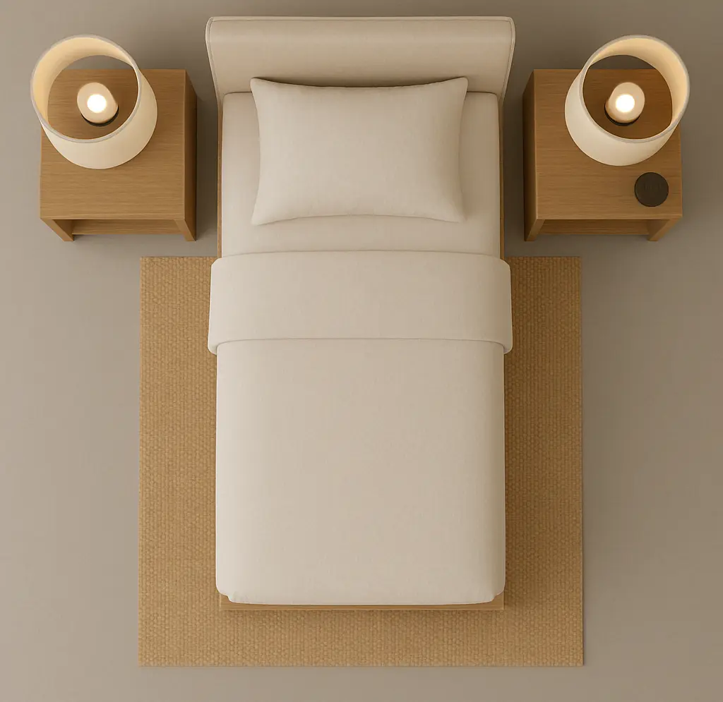 Cama individual: 120×180 cm o 150×240 cm, sobresaliendo 90–120 cm para apoyar los pies cómodamente.